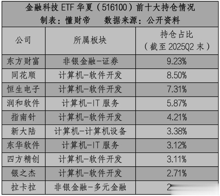 持仓方面,它覆盖了A股最优质的金融科技资产,互联网券商龙头东方财富,金融科技龙头同花顺、恒生电子、润和软件等,都被“打包”进了前十大持仓股。